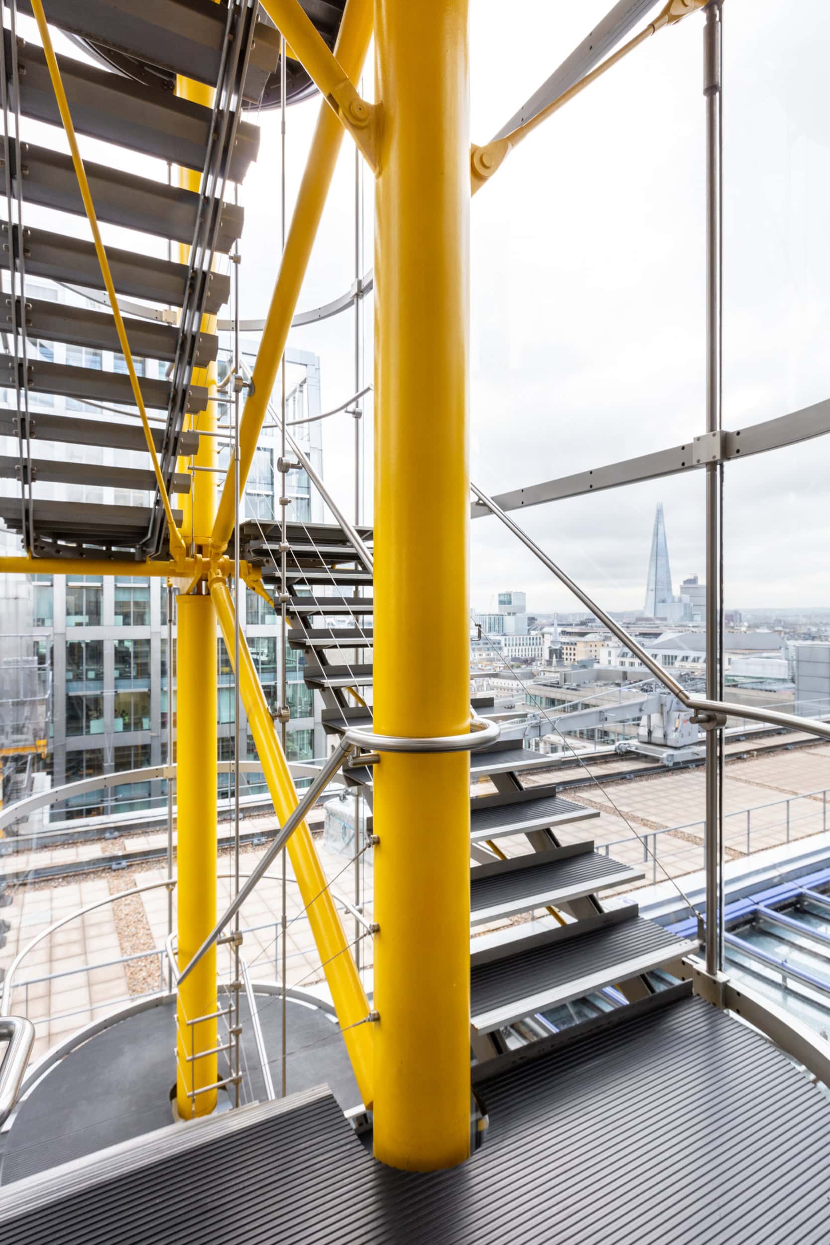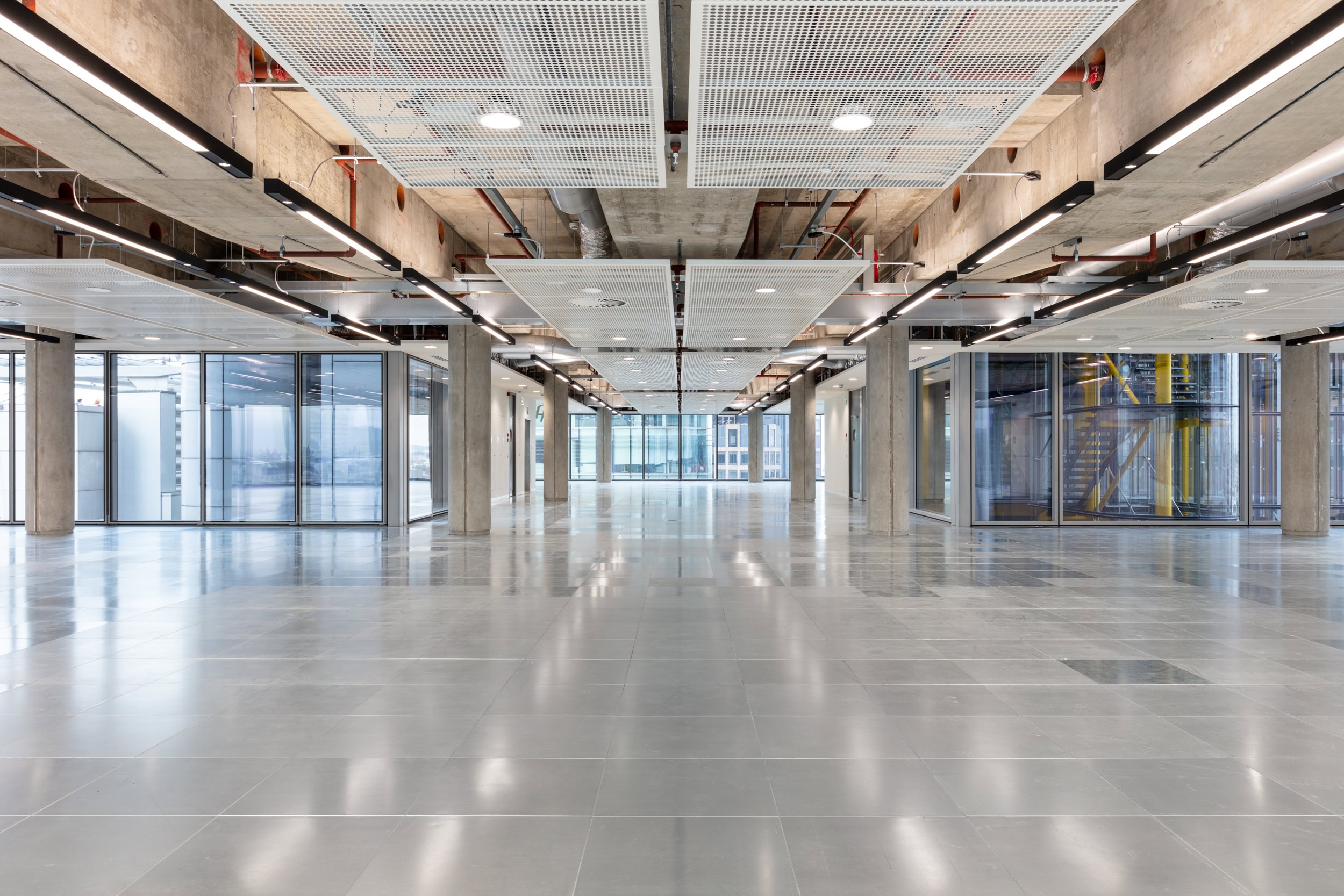 Phase one involved a complete overhaul of multiple upper floors, stripping them back to the shell and core and introducing new mechanical and electrical services. A stunning “SAS mesh raft” ceiling frames semi-exposed services. These works also included the refurbishment of washrooms, featuring high-spec cubicles, terrazzo worktops, elegant hardware and lighting to achieve a sophisticated finish.