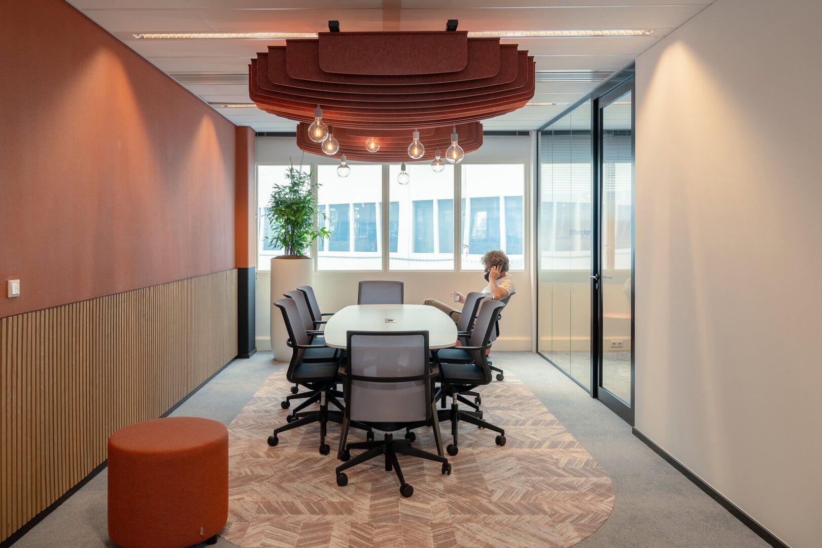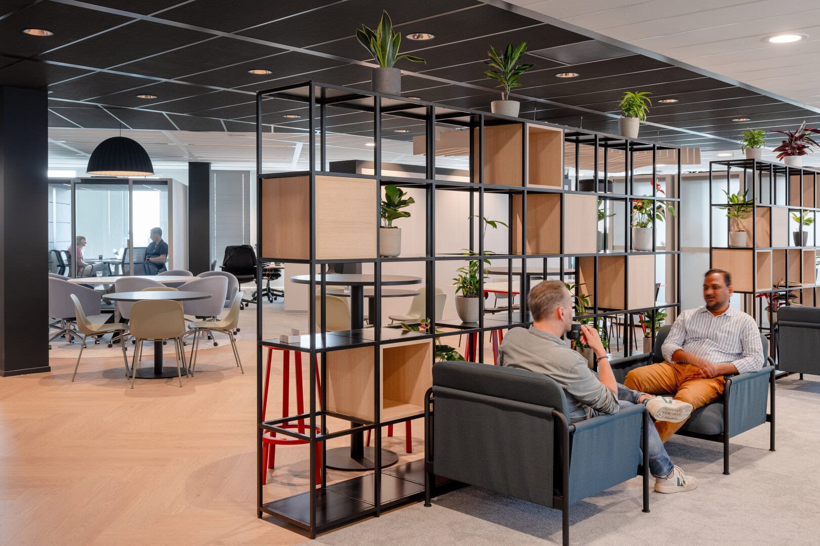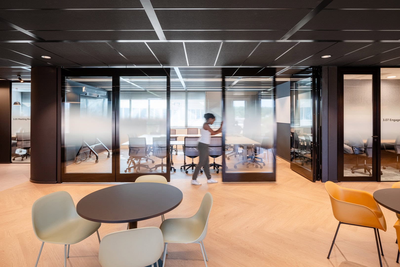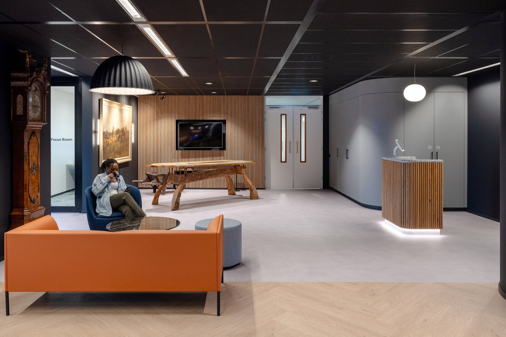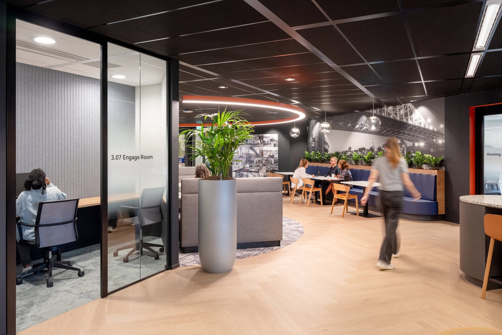 Drawing influence from Arcadis’ offices in London and Melbourne, the design featured dark timber finishes, bold black walls and ceilings, and subtle touches of orange. Carefully zoned areas supported focused work, active collaboration, and social interaction, creating a workspace that’s both efficient and inspiring.