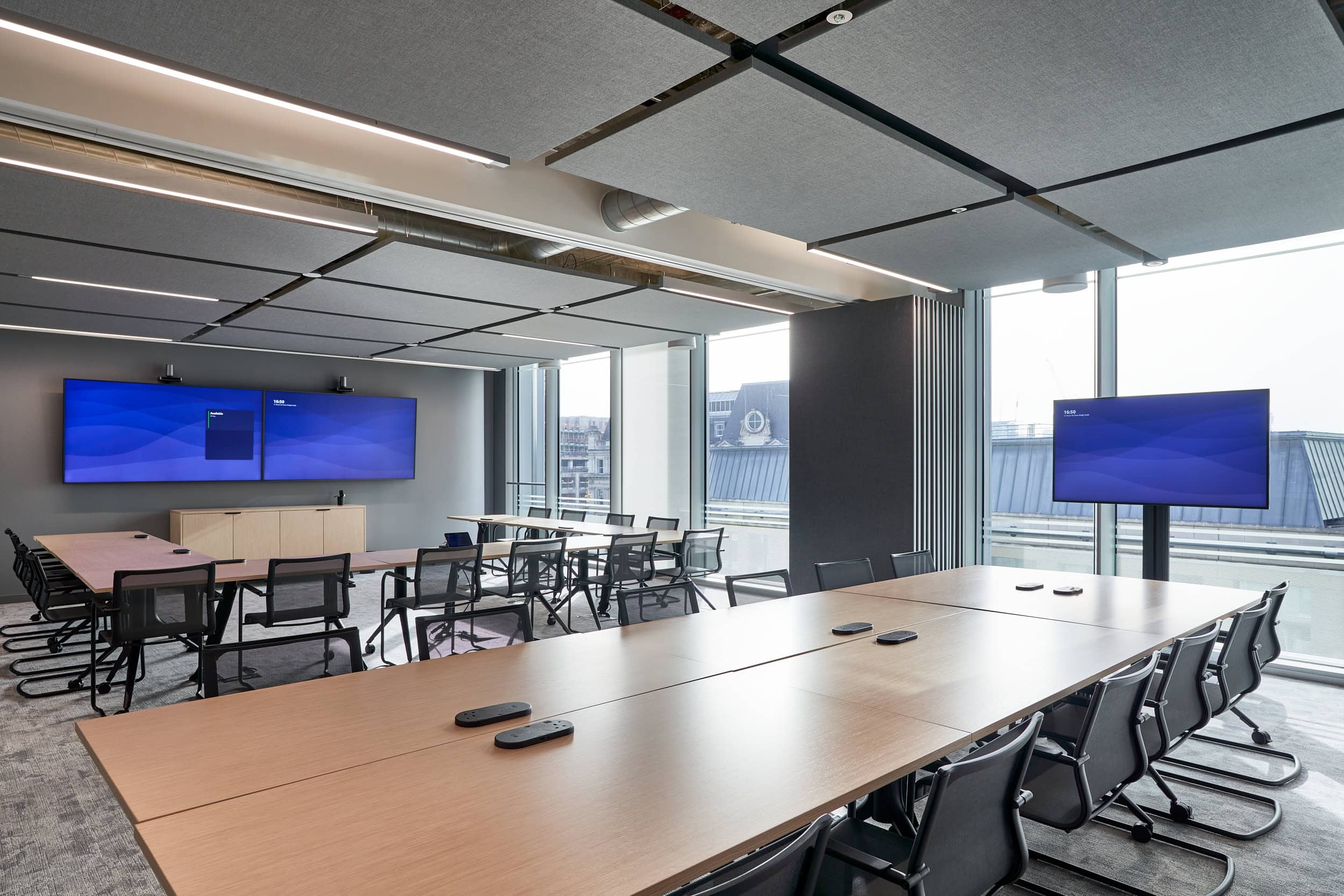 The diverse and open-plan workplace is made effective through widespread use of acoustic components and extensive audio-visual equipment. Coordinating installations with existing services and fire systems, along with the added complexity of installing acoustic baffles presented challenges.