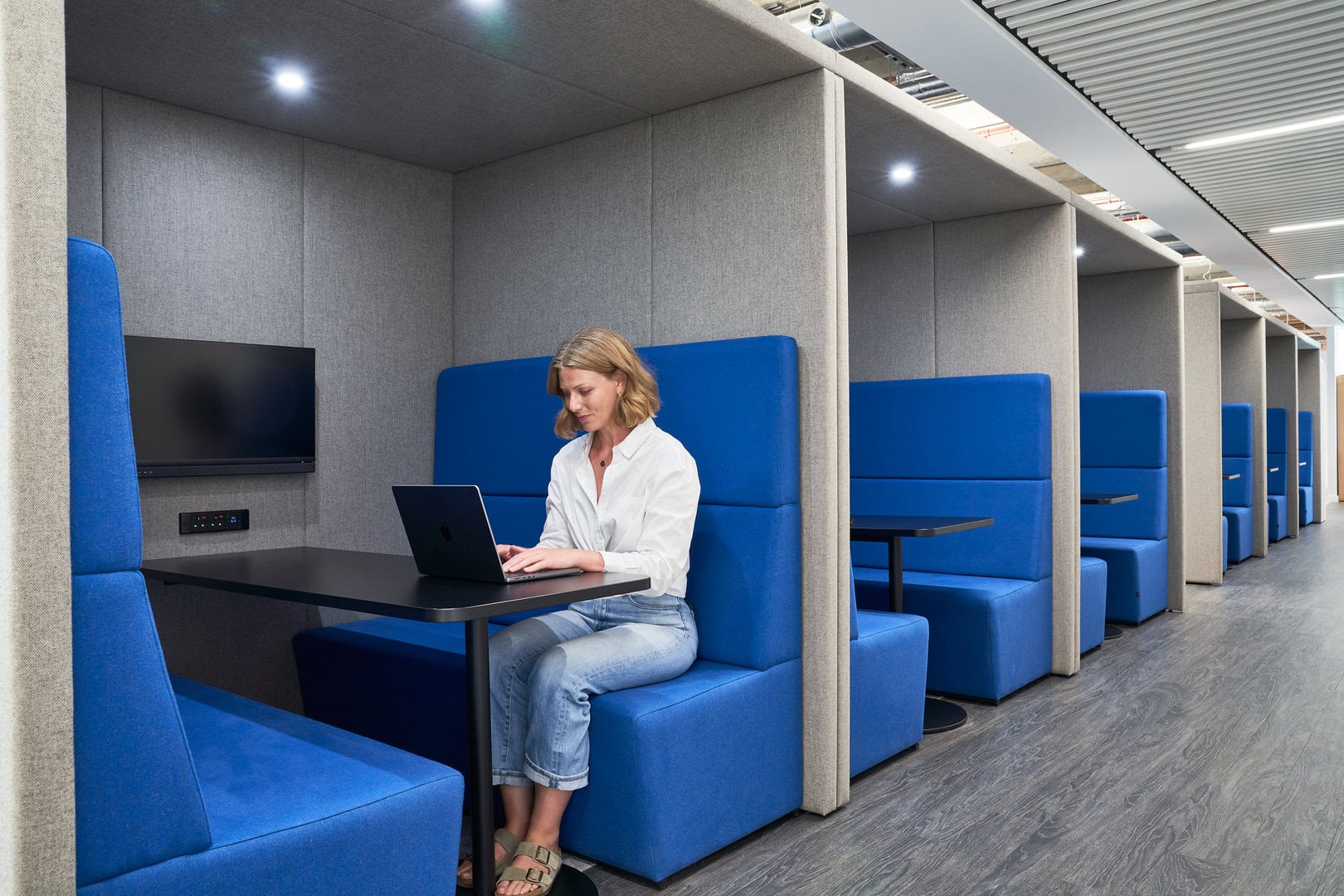 A diverse and largely open-plan workplace environment that that allows collaboration thanks to the widespread incorporation of acoustic components.