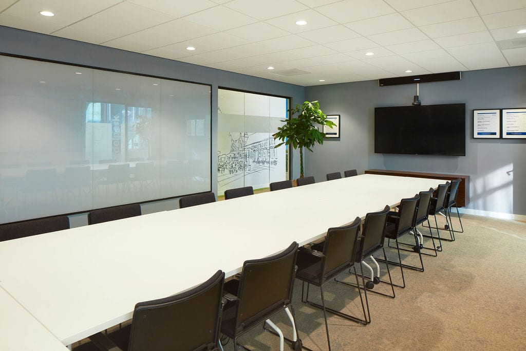 Flexible workspace layout accommodated varying collaboration needs including enclosed and open meeting rooms, individual booths and boardroom