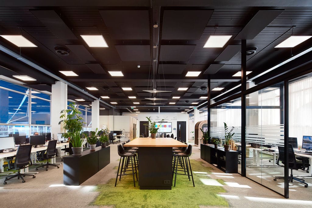 Industrial elements, a branded green wall and Dutch landmark decor create a unique workspace