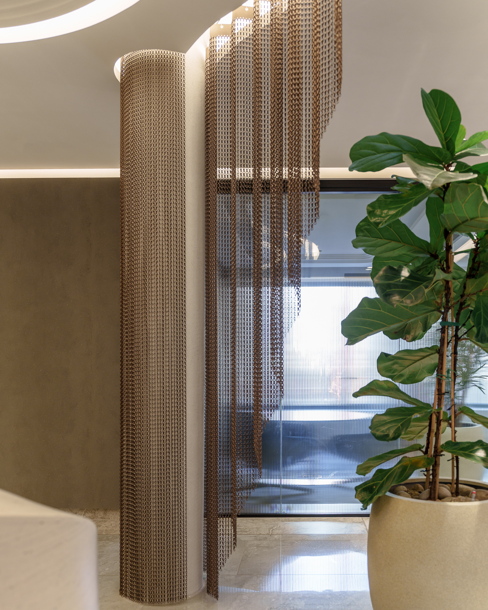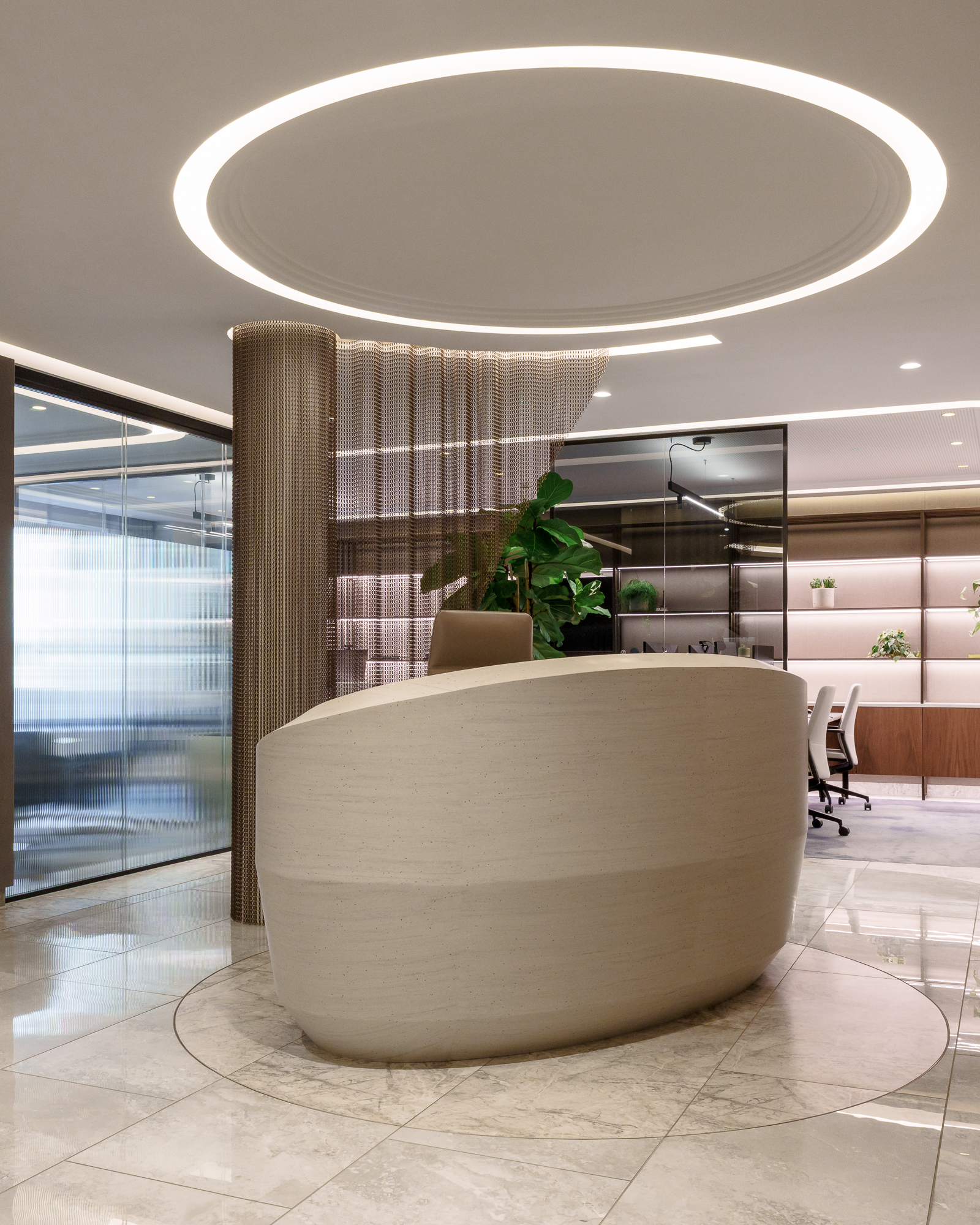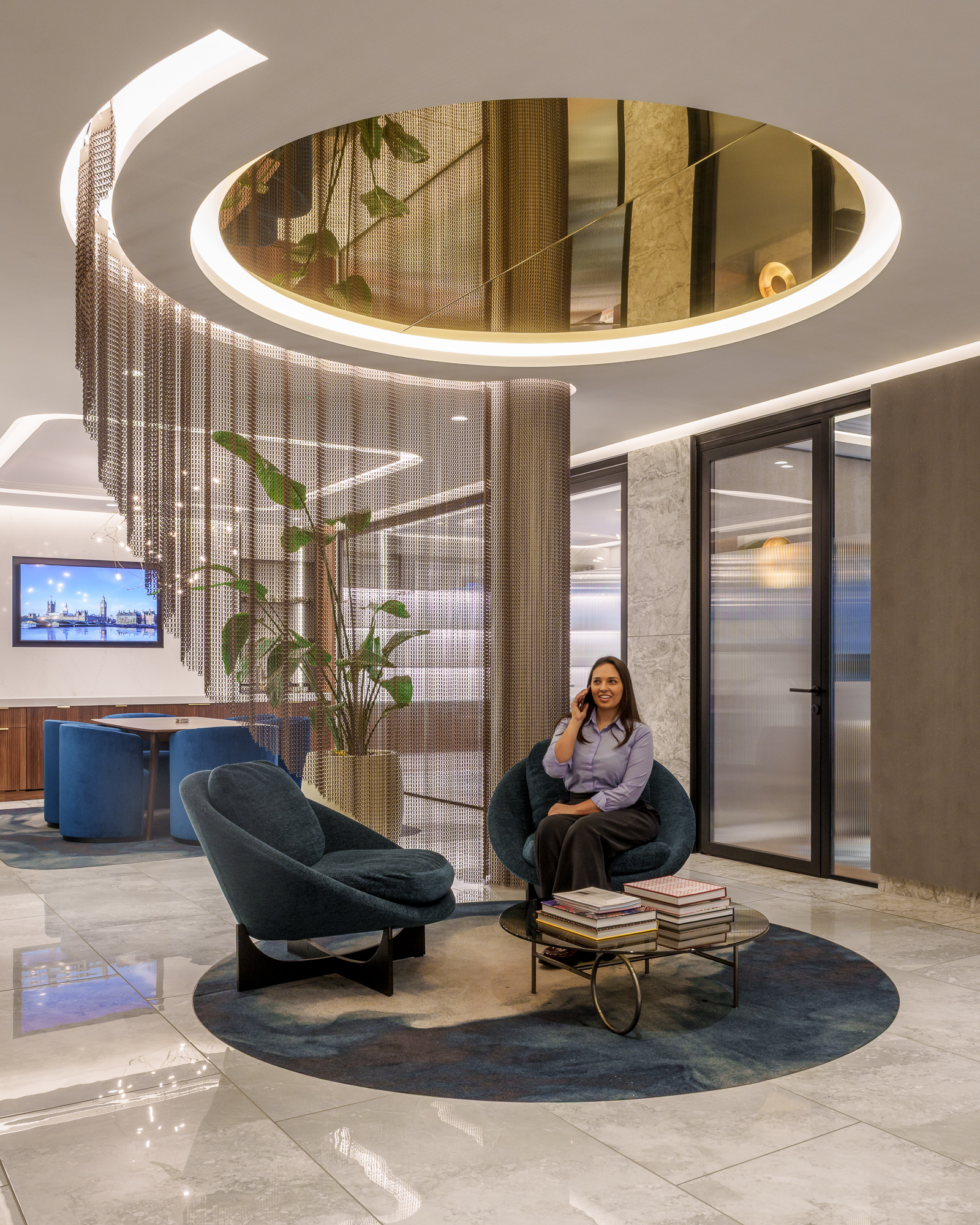 The reception area creates a statement of reassurance that this company is here for the long-term. Its logo sits central to the space, carved into a Corian surface which has the appearance of a Roman stone wall. This sense of longevity is echoed in the materials and design of the reception desk, a striking stone structure that provides visitors with a feeling of permanence as soon as they enter. The backdrop to the desk is an eye-catching cascading chain curtain that flows around the columns, just one of the elements of the design which encourages people to flow seamlessly through the space.