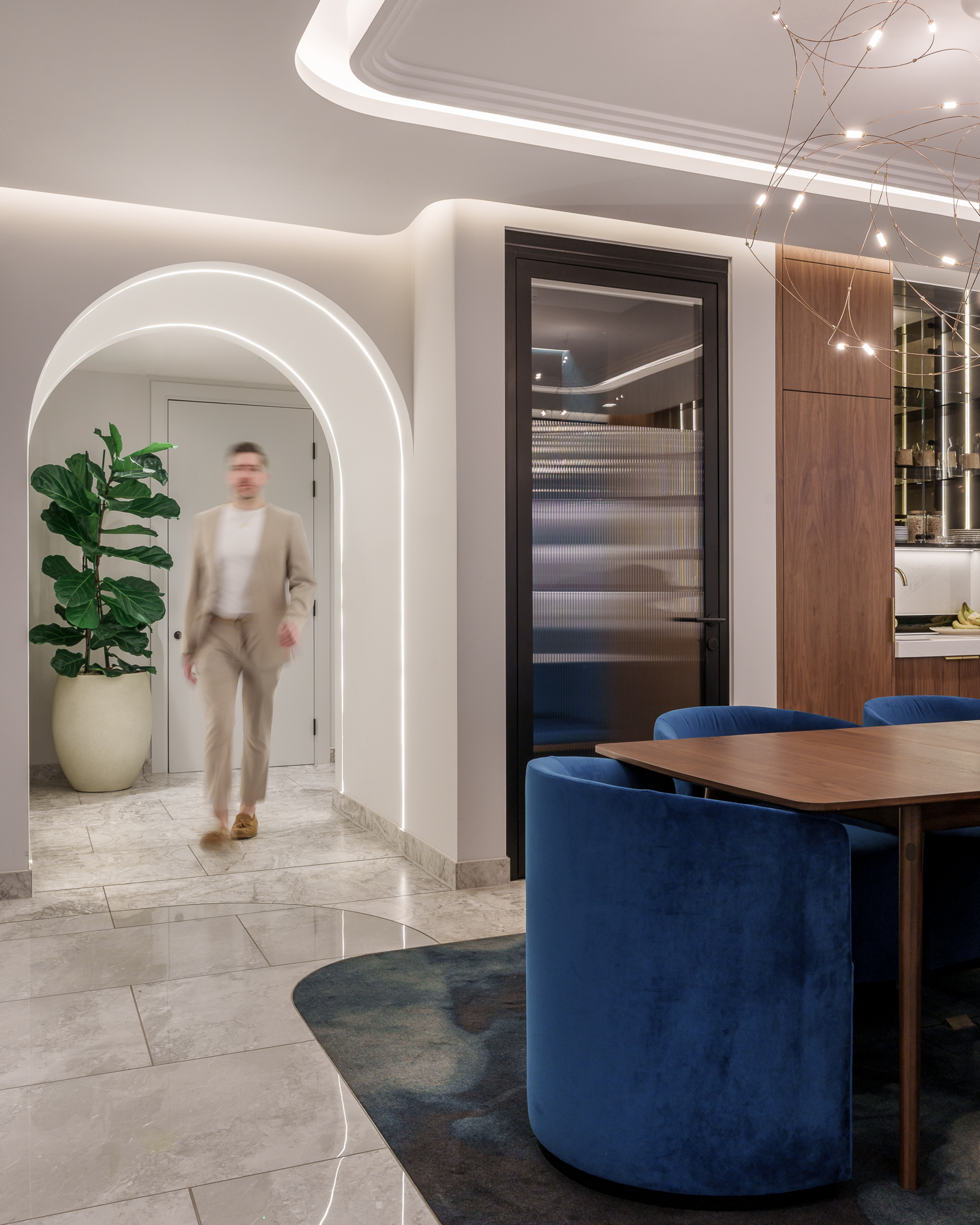 Material choices are key throughout to maximise light, create a sense of fluidity and embed a feeling of timeless elegance and luxury into the space. Seamless porcelain and marble flooring in both matt and gloss finishes are mirrored across the walls, providing a perfect surface to refract light from the LEDs, which softly outline the ceilings. A sense of warmth is created through walnut joinery, brass accents, teal velvet furniture and bespoke coloured carpet, while privacy is maintained through stylish acoustic panels, voile curtains, smoked glass and the addition of a private phone booth.