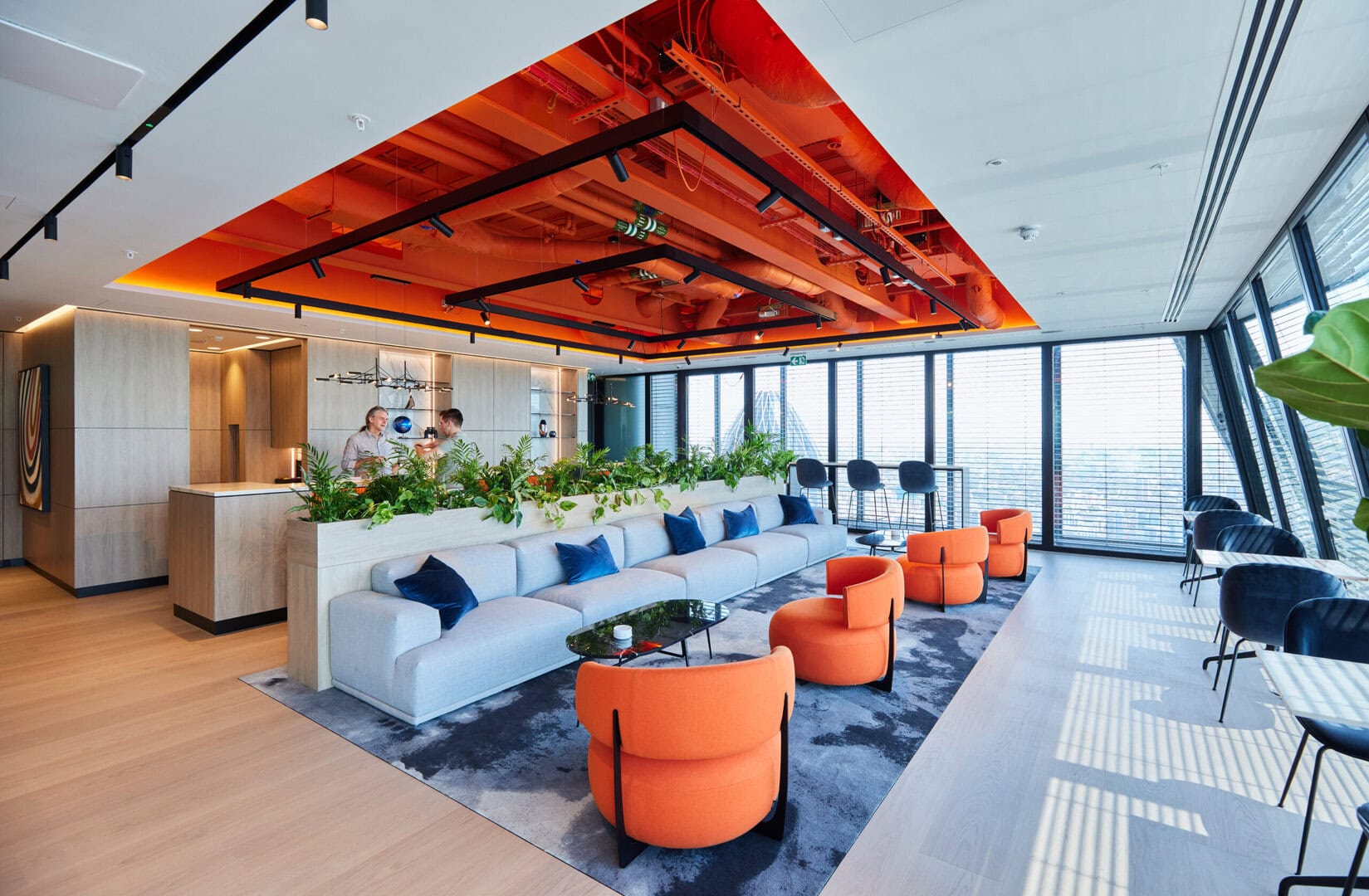 Another standout feature is the breakout area, highlighted by its orange ceiling detail. This newly introduced space has quadrupled the available breakout area for employees, offering both lounge and dining zones. Designed with flexibility at its core, the space can seamlessly transform into an additional event venue, complete with full hospitality capabilities and arguably the best panoramic views of London.