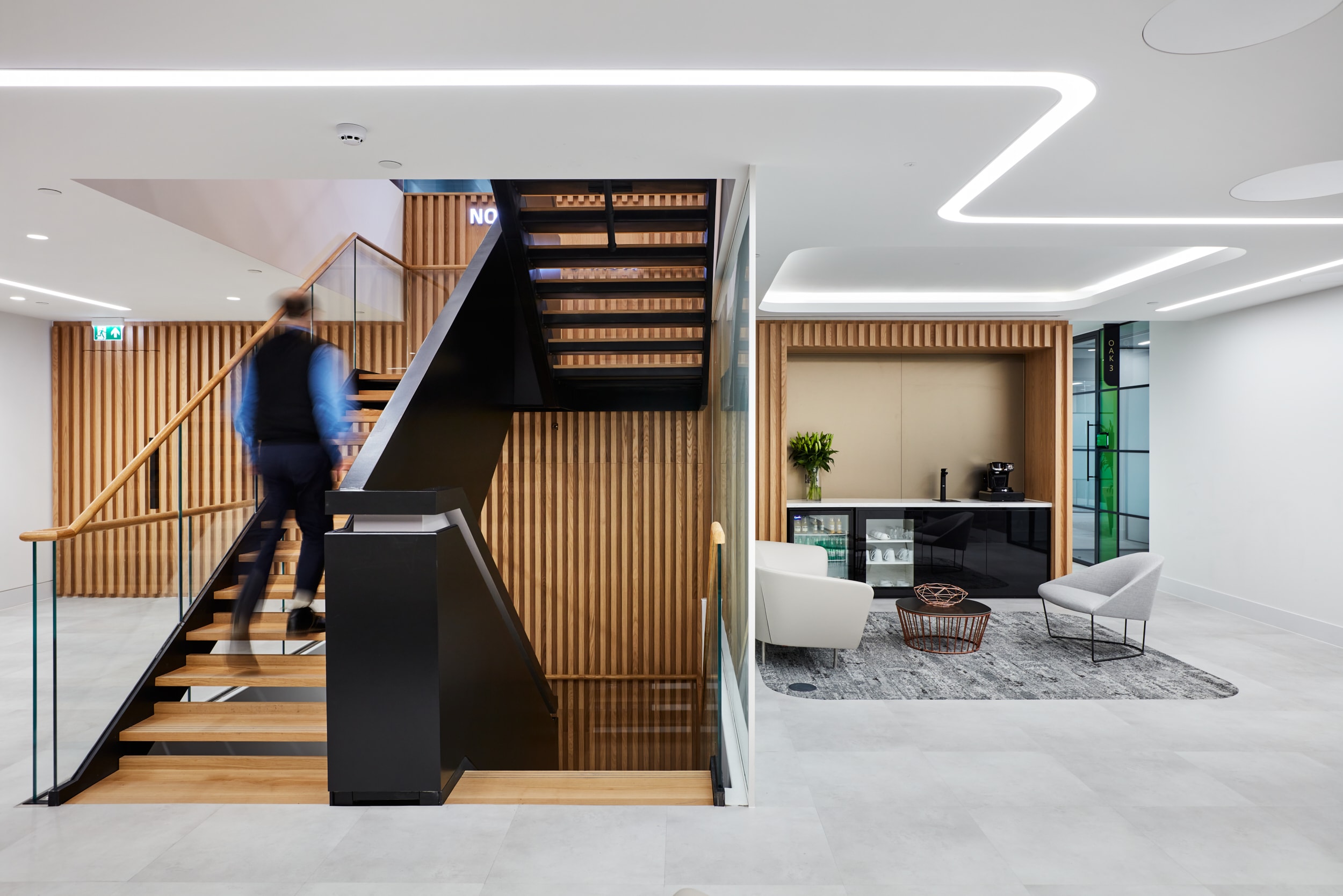 The office spans two levels, linked by a carefully designed staircase to promote social interactions. Placing the main tea point on the upper floor encourages movement and interaction, forming a vibrant hub with an open kitchen, banquet seating, and communal tables for a relaxed atmosphere. Adjacent lounge areas offer agile workspaces with comfortable sofas and café-style seating.