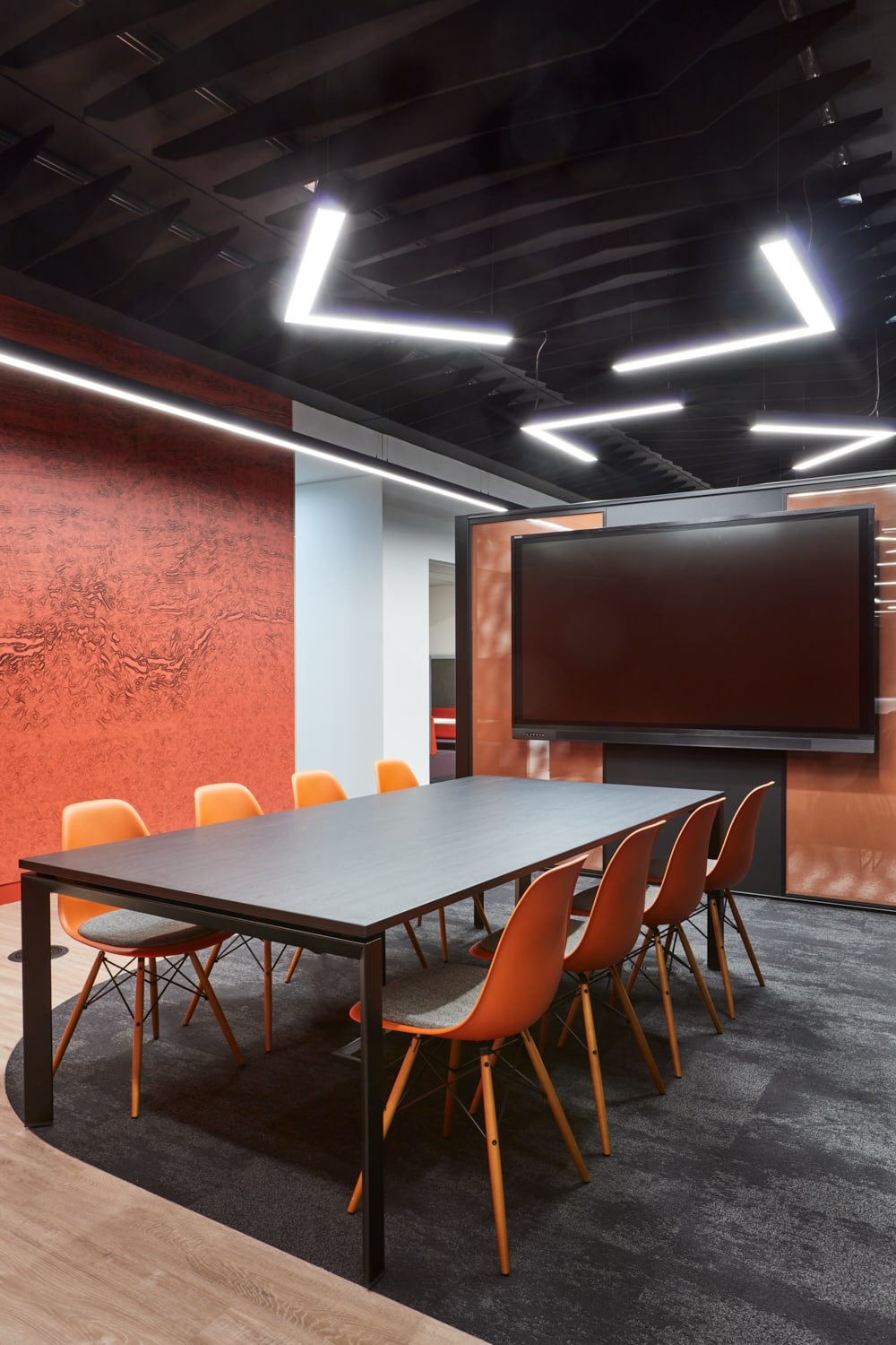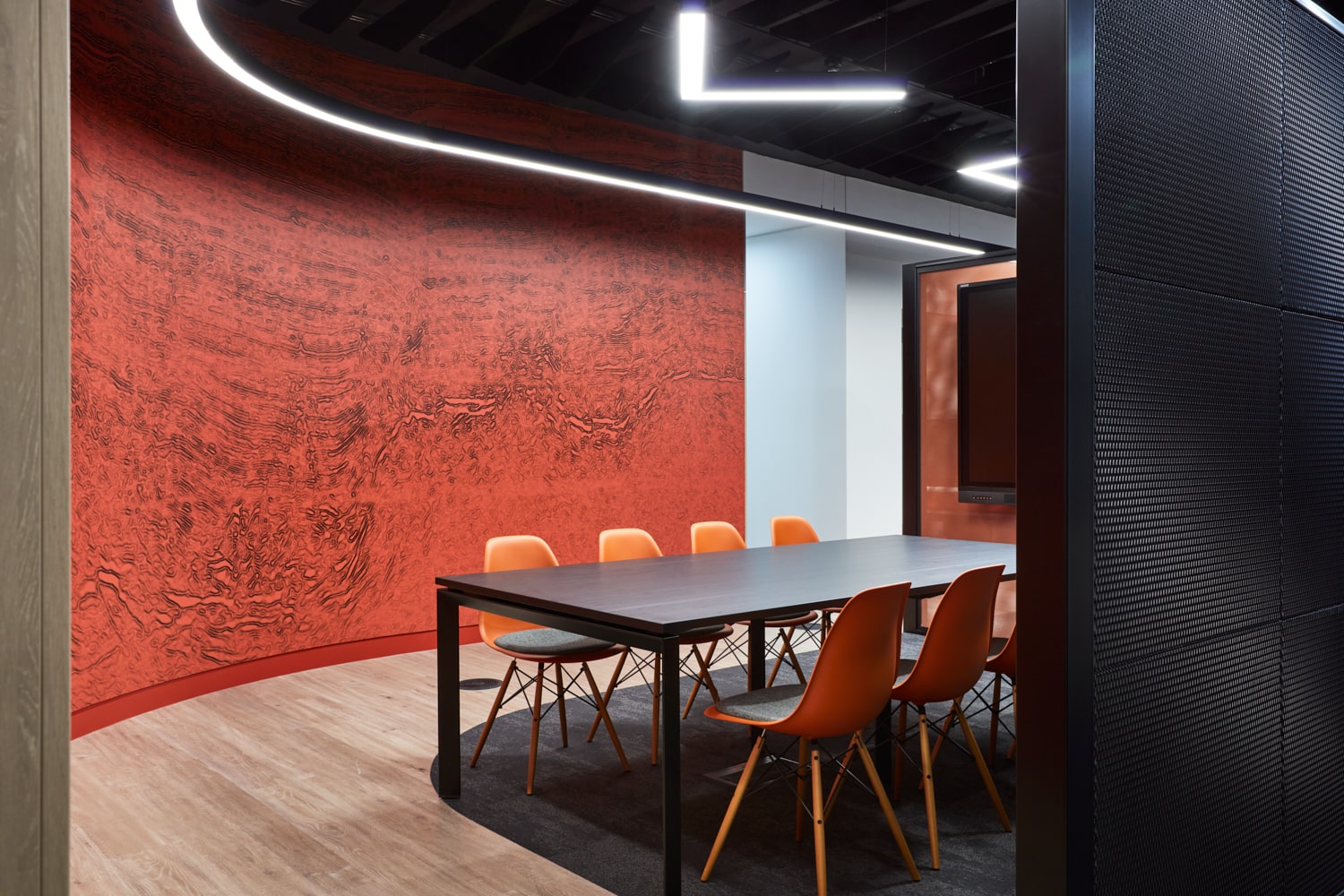 To enhance collaboration, each floor features diverse common spaces, including lounge areas, huddle rooms, and booth seating. The reception area leaves a lasting impression with a layered glass desk and custom manifestations celebrating the company’s achievements.