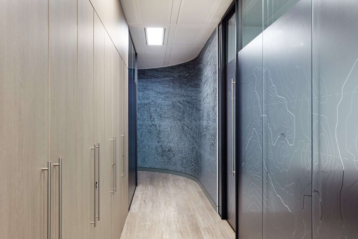 The project’s challenge involved reimagining the client’s scattered workspaces into a unified, vibrant headquarters. The design solution prioritised collaboration through a forward-thinking approach, reflecting the clients brand ethos. Drawing inspiration from the land and sea, our concept seamlessly integrates continuous contours and typography into the workspace.
