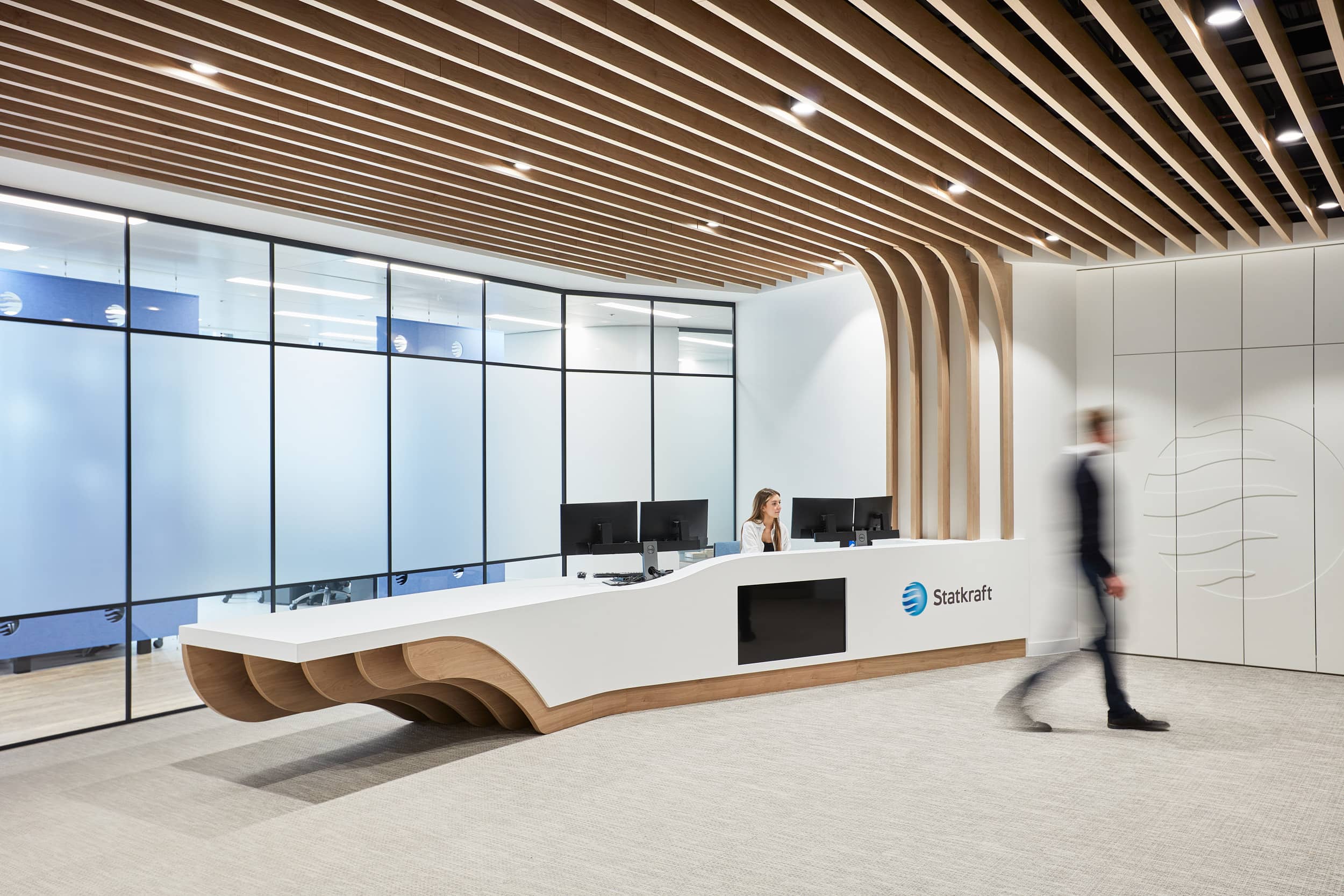 The Statkraft brand permeates every facet of the workspace, thoughtfully integrated into design elements, from partitioning to manifestations. Visitors are greeted with an impressive reception desk, featuring geometric timber forms mimicking nature, juxtaposed against hard white finishes, amplifying the connection between natural and man-made objects, emulating the theory behind Statkrafts’ brand.