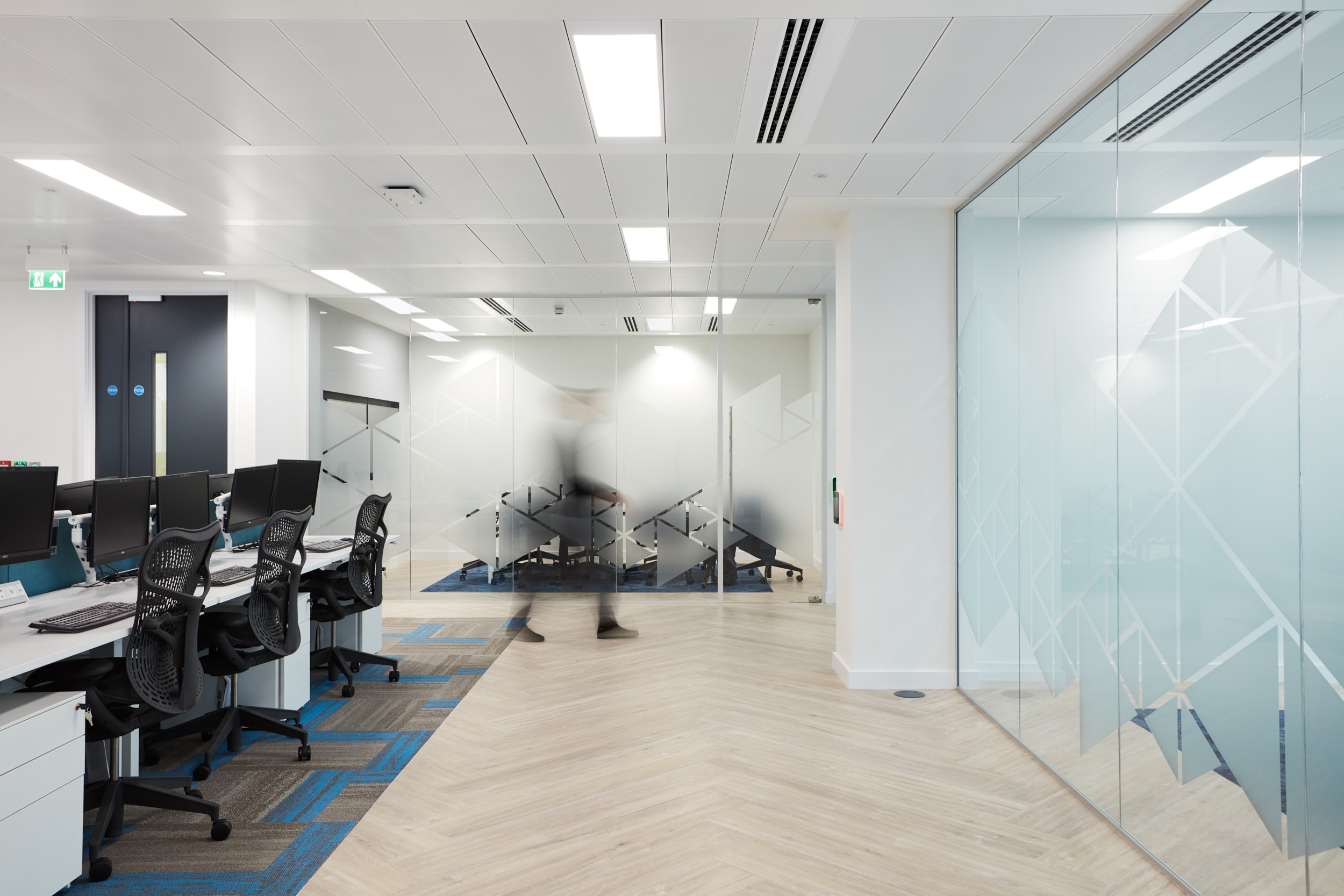 The user journey guides staff through reception into the main office area, which includes a suite of meeting rooms and a refreshment area. To enable a sense of flexibility through the main work area and cater for continued expansion, the space has no barriers, created in a more open plan style to encourage continuous cross-team communication between permanent staff and creating an open culture so travelling staff feel more at ease.