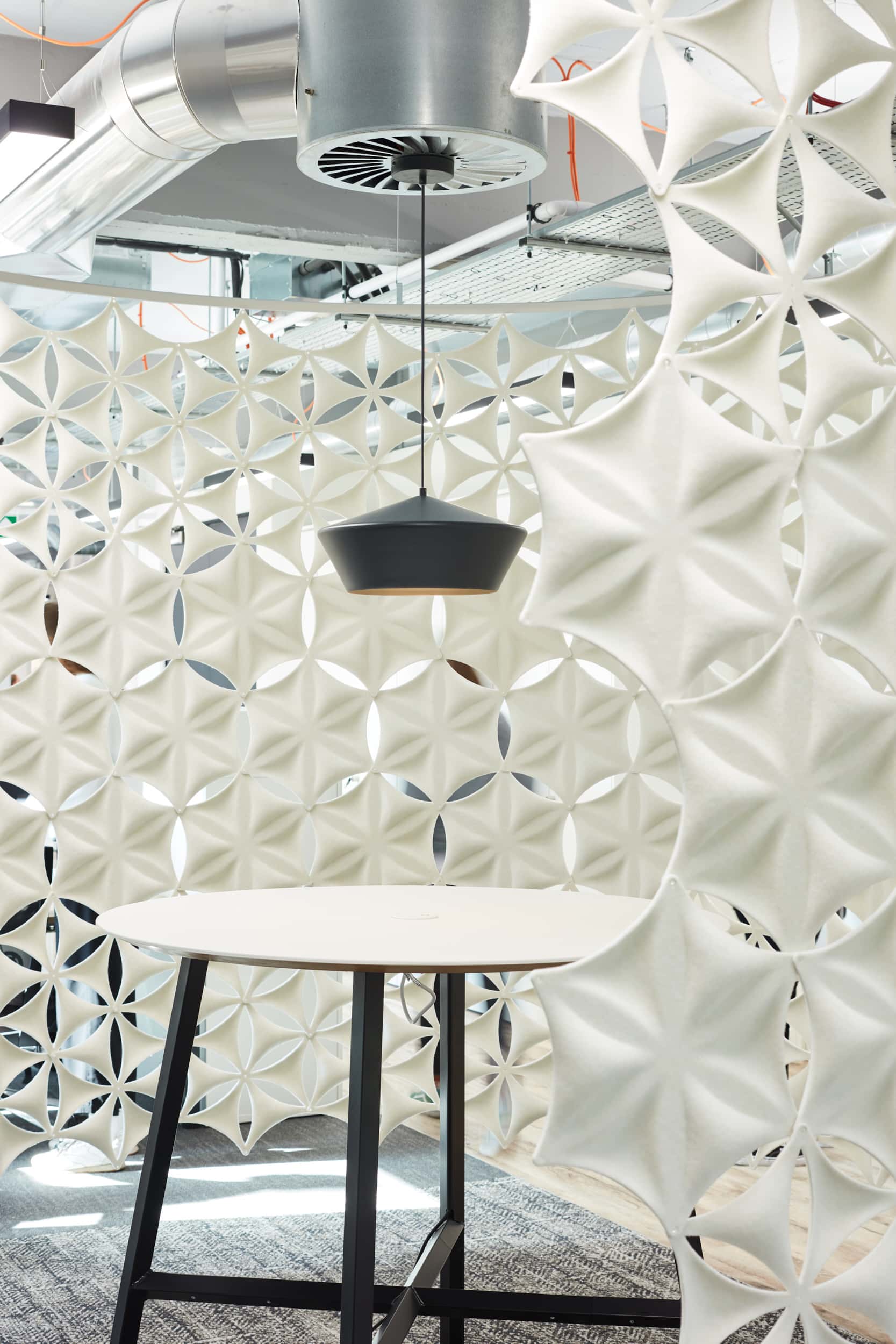 Throughout the floor plate, satellite collaboration zones have been strategically placed, each boasting a distinctive design element. This could range from a feature ceiling element to ceiling-hung acoustic panels, creating an intimate ambiance and ensuring that staff feel comfortable utilising these spaces. Simultaneously, these design elements enhance the overall aesthetics of the workspace.